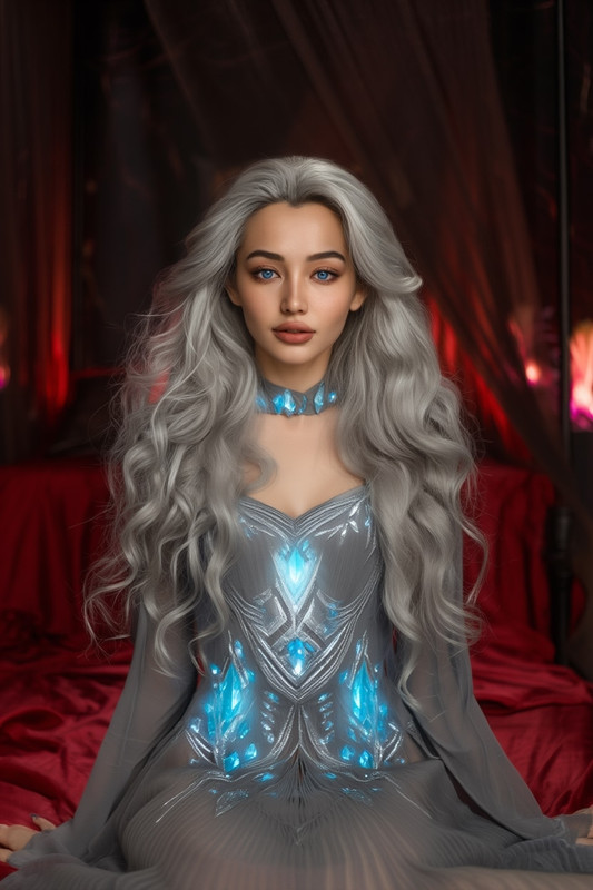 Ткань была цвета живого серебра, лунного света, струящегося по воде. Она переливалась, будто внутри текла ртуть, а по подолу вились тонкие нити голубого огня — прохладные, как лёд в летнюю ночь. Вставки из сапфиров и аквамаринов мерцали, словно звёзды, упавшие в бездну. Платье было элегантным, почти целомудренным на фоне здешней эстетики: высокий ворот, длинные рукава, но облегающий силуэт подчёркивал каждую линию тела, а разрез от бедра открывал ногу при движении, обещая тайну.