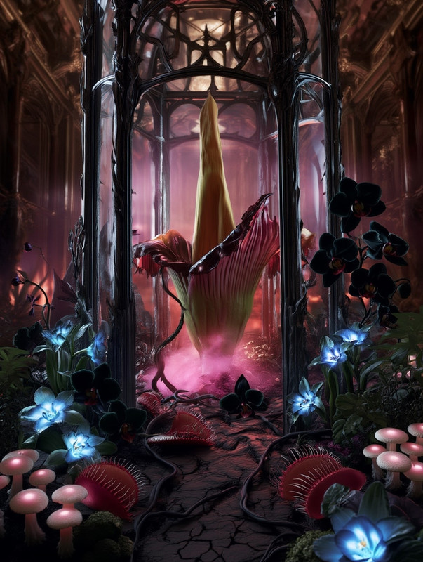 Я шла дальше, ведомая ароматом, усиливавшимся с каждым шагом, и вскоре очутилась в огромном зале, где воздух сгустился от сладости. За аркой открылся сад — дивный, запретный. Цветы вздымались исполинскими стеблями, их лепестки, огромные и демонически прекрасные, напоминали аморфофаллус титанический, но были ещё провокационнее: изогнутые, почти фаллические формы с пульсирующими под бархатистой кожей прожилками источали нектар. Тяжёлые капли падали вниз, наполняя пространство опьяняющим зноем.