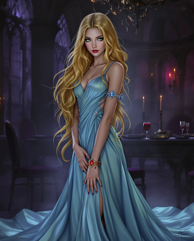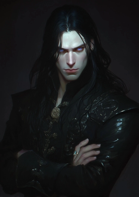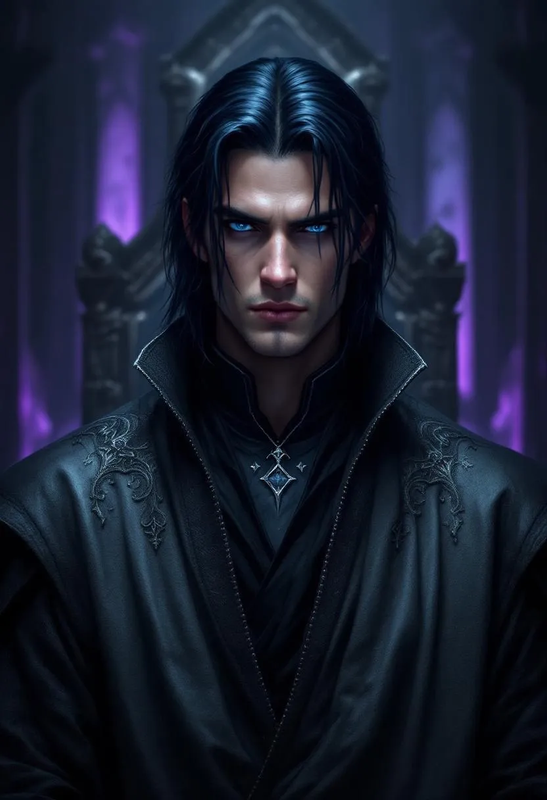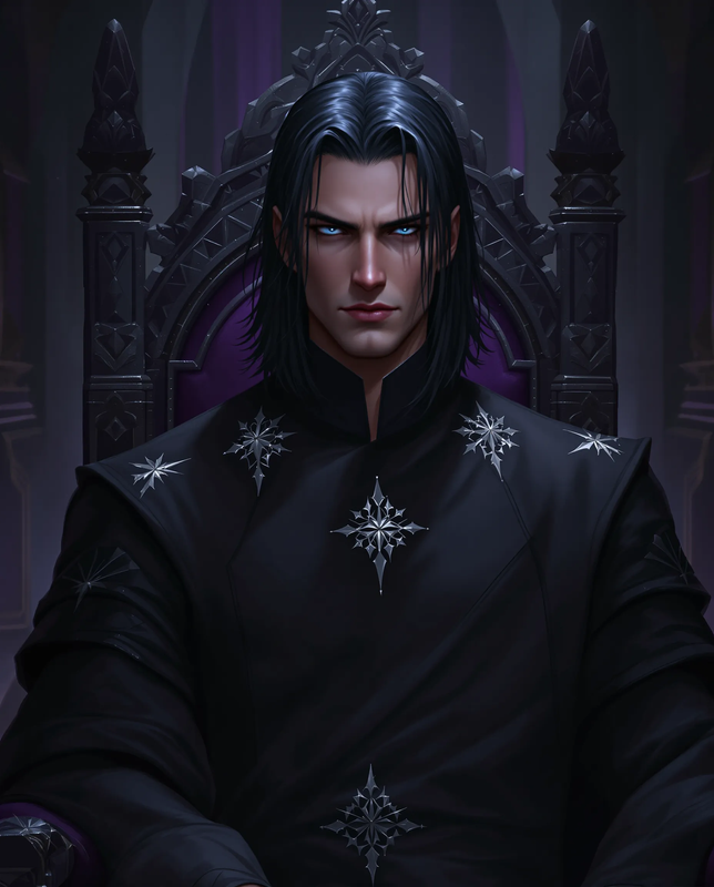 Мрачная, резкая мужественность. Острые скулы, тонкий нос с легкой горбинкой, губы, которые, казалось, созданы для язвительных фраз и, возможно, чего-то более чувственного. Длинные черные волосы, собранные в низкий хвост, и тонкая корона из обсидиана, знак его власти.