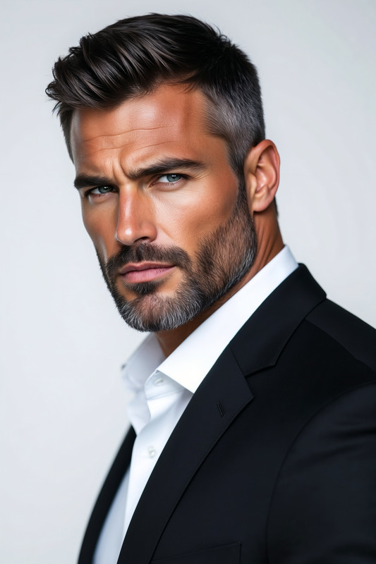 Сергей — за сорок, с крепкой фигурой. Широкие плечи, сильные руки, чуть выступающие вены. Тёмные волосы с лёгкой сединой на висках. Лицо жёсткое, скуластое, с упрямым подбородком. В целом он мужчина, от которого чувствуется сила, контроль и вспыльчивый характер под тонким слоем внешнего спокойствия.