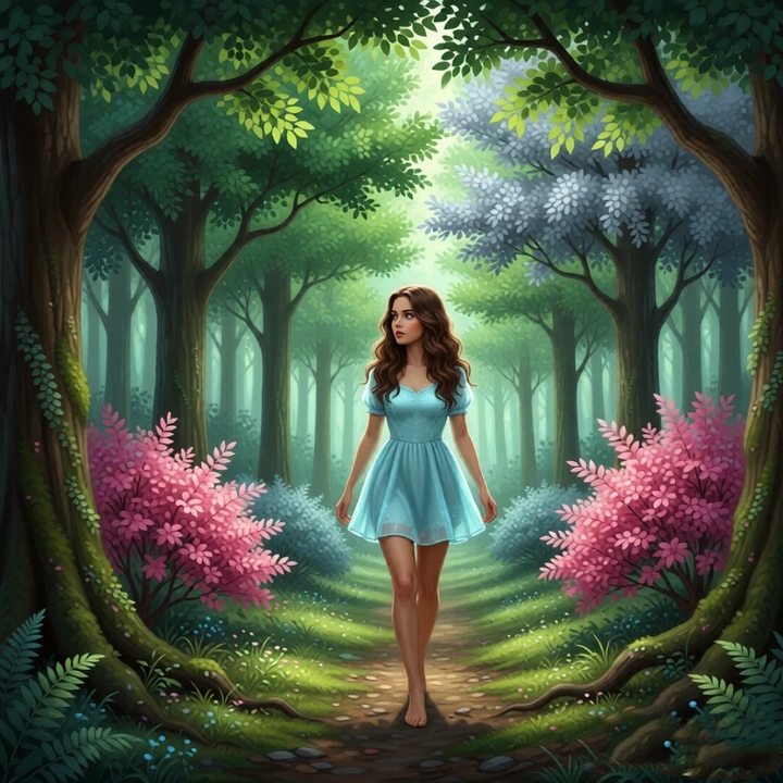 Я стояла посреди незнакомого леса, окружённая деревьями с искрящимися серебристыми листьями, которые казались светящимися изнутри. Воздух был наполнен мягким, едва уловимым ароматом цветов, которых я никогда не видела прежде. Ветки слегка покачивались, хотя вокруг не было ни единого ветерка, а из глубины леса доносилось мелодичное журчание, словно сама природа играла на невидимых струнах.