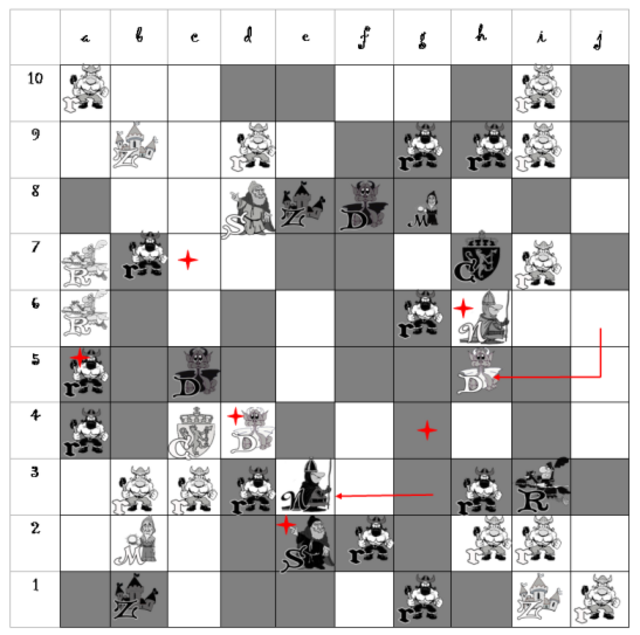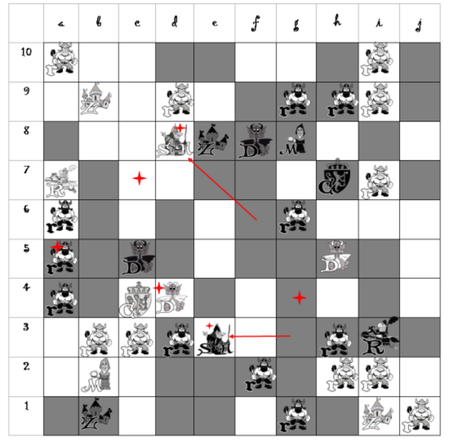 Сложнее, если оборотная сторона – фигура. Если изначально двойная карта – пустая клетка, на игровом поле появляется новая фигура по цвету и номиналу открытой карты. Если изначальная карта – фигура того же цвета, что и открытая, она получает дополнительные свойства по новому номиналу. Например, если карта была Драконом, а оборотная ее сторона – маг, то в итоге появляется Дракон-маг, который способен перемещаться и как Маг (в любую сторону на любое количество клеток), и как Дракон (буквой «Г»). А если цвет открытой и изначальной фигур различаются, то такую фигуру могут использовать оба игрока в соответствии с номиналом и цветом. И срубить могут оба игрока.