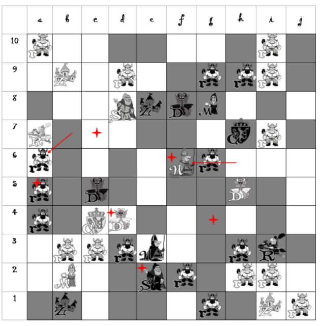 Самая многочисленная фигура – Разбойник (r). Разбойник ходит на одну клеточку вверх или вниз. Рубит наискосок. У каждого игрока десять таких фигур.