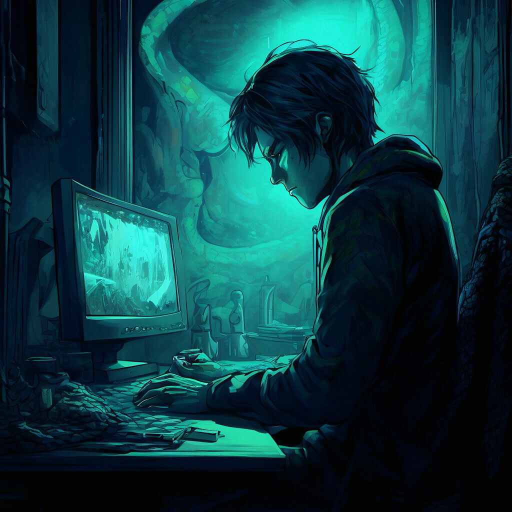 В этом мрачном коридоре, где стены пропитаны страхом, я вновь и вновь встречаю искажённые отражения реальности. Первым из них является гротескный образ накачанного наркомана с изуродованным лицом и перетянутым бинтами торсом. Его тело — карта страданий, где каждая вена выступает наружу, словно карта подземных рек. Он преграждает мне путь, насильно предлагая неведомый яд, пытаясь затянуть в пучину зависимости своим безумным хохотом.