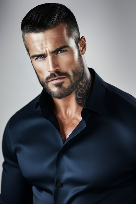 Марк предстаёт передо мной как мужчина, чья внешность кричит о власти и тайнах. У него тёмные волосы, аккуратно подстриженные, но с лёгкой небрежностью, которая добавляет ему дикого обаяния. Голубые глаза острые, как лезвие, с холодным блеском, но в глубине таится тепло, которое он редко показывает. На шее и руках виднеются замысловатые татуировки, чёрные линии которых переплетаются, намекая на его сложное прошлое. Вещи в темных оттенках, идеально сидящие, подчёркивают его широкие плечи и атлетическое телосложение, а лоск в его облике — от дорогих часов до уверенной походки — говорит о мире, где он полноправный хозяин.