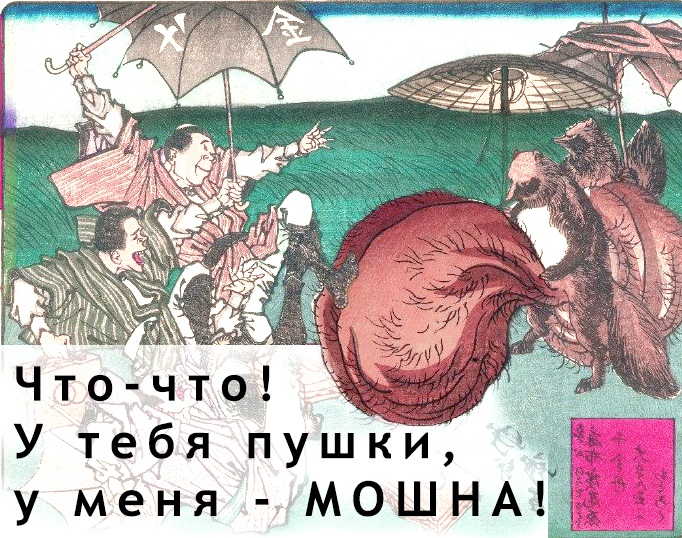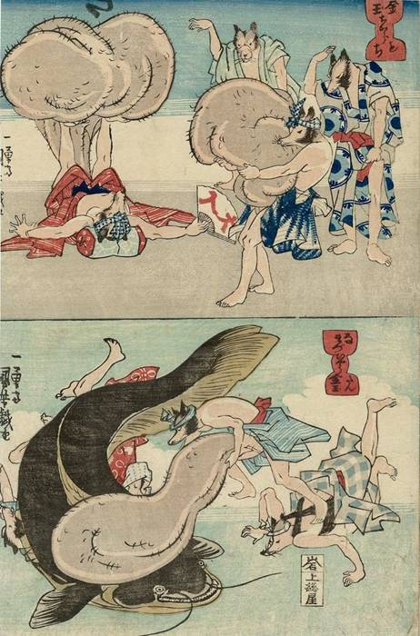 Следующий зверообразный ёкайчик тоже имеет несколько «телесных» особенностей. Речь о существе по имени КАППА. Живут каппы в воде и очень любят огурцы и всякие там озорства. Могут бросаться в людей огрызками съеденных огурцов, брызгать водой. Ну, а могут и сожрать, если человечек очень уж приглянулся. Что до упомянутых особенностей, у капп их несколько. Во первых, на голове у этих существ имеется похожее на блюдце углубление, наполненное водой. Зачем? А потому что вода для каппы то же, что волосы для библейского Самсона или земля для греческого Антея – придаёт существу силушку богатырскую! Конечно, против любой силы найдётся хитрость. Какая – расскажу чуть позже, а пока закончим осмотр «телесных» особенностей. Считается, что руки каппы соединены друг с другом, и, если потянуть за одну, то другая сожмётся или вообще может выпасть. Интересно, откуда у японцев такие сведения? Неужели проверяли? И ещё интереснее, откуда они знают о следующей особенности. Вроде бы у капп ТРИ задних прохода! Для чего им так много, японцы тоже объяснить не потрудились. Но только представьте, это сколько же огурцов нужно сожрать, чтобы обеспечить работу трём отходным отверстиям! Тогда, пожалуй, не стоит удивляться, что каппы пытаются занести в меню всё, что движется, включая людей. Но пугаться их не стоит. Дело в том, что каппы – истинные порождения Японии, т.е. очень вежливы. Поэтому, если им учтиво поклониться, они стопроцентно ответят тем же, и тогда – внимание хитрость! – придающая им силы вода в головном углублении вытечет, и они станут беспомощными. Можете, конечно, попытаться предложить каппе парочку огурцов – это наверняка отвлечёт его от намерения сожрать ВАС. Но, некоторые поступают ещё проще – вроде шутников на приведённой ниже гравюре.
