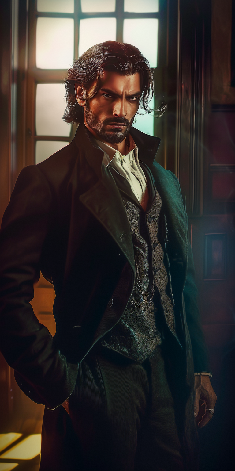 Мужчина был одет в старомодную просторную рубашку с расстегнутыми верхними пуговицами, черный жилет и брюки. Из кармана жилета выглядывала золотая цепочка часов.