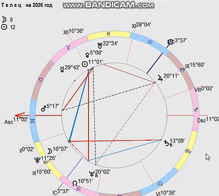 .Давайте теперь на карту поставим планеты. Будет более..понятно и более конкретно. Поехали. итак, Солнце. Вот надо же прям вот так солнце угодило на куспид двенадцатого дома. Солнце это то, что вас радует. Двенадцатый дом.- «Хочу принадлежать сама себе. Хочу нигде не работать, ни от кого не зависеть. Вообще не хочу работать»... Вы двенадцатидомница. Человек 12 -го дома, он вряд ли будет работать на фабрике, на заводе, где -то на конвейере, делать какую -то тупую, ненужную работу. Вряд ли будет это делать Телец в 2026 году... Чего хочет телец? Релакса? Хочет жить независимо? Ну, почему бы нет? Вообще -то можно жить на проценты. Можно потратить свои деньги, купить какой -то домик на берегу Тихого океана и просто наслаждаться запахом моря. Просто уединиться. Но, бывает так, что уединение - вынужденное. Например, типа уволили с работы и вот теперь принадлежу сама себе и не знаю, что делать. Но обычно Солнце это то, что человека радует. Вас радует 12 -й дом? независимая жизнь?.. я не против.. я даже рад… двенадцатый дом некоторые астрологи трактуют негативно… как заточение… для меня двенадцатый дом этот человек живущий для себя .. это такой эгоист который наслаждается жизнью, тратит деньги на себя и для него - все хорошо, .. обычно я делаю прогноз для девушек. По Солнцу, может быть, это ваш муж, бывший или настоящий, решил уехать за границу. 12 -й дом, заграница, экзотическая страна. Или муж решил, ну, в негативном понимании, муж ушел в 12 -й дом, просто ушел в запой. Нет, я не хотел бы такого для тельца... Мужчина ушел бухать. Некрасиво как -то.