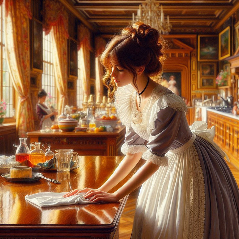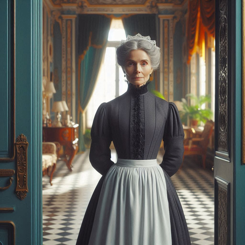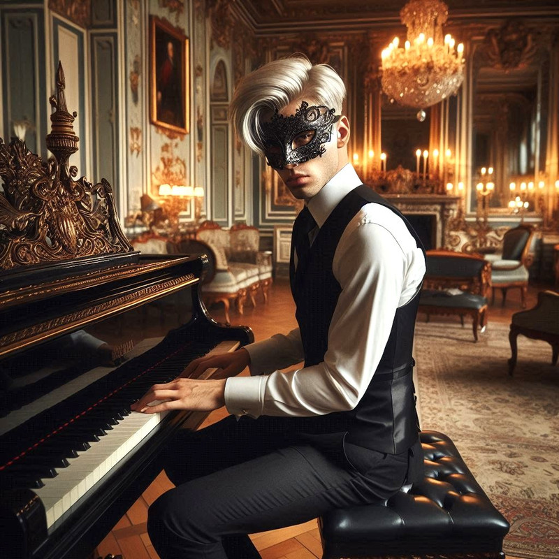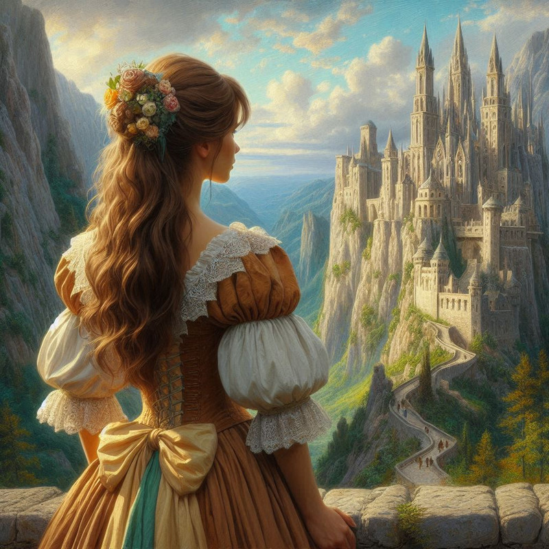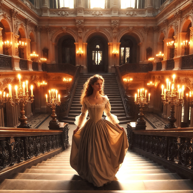 Она была воплощением изящества в своем нежно-бирюзовом платье с серебряными нитями, которые переплетались на корсете, словно паутина. Черные волосы были собраны в высокую прическу, украшенную жемчужными шпильками. На шее — ожерелье с камнем, похожим на застывший лунный свет.