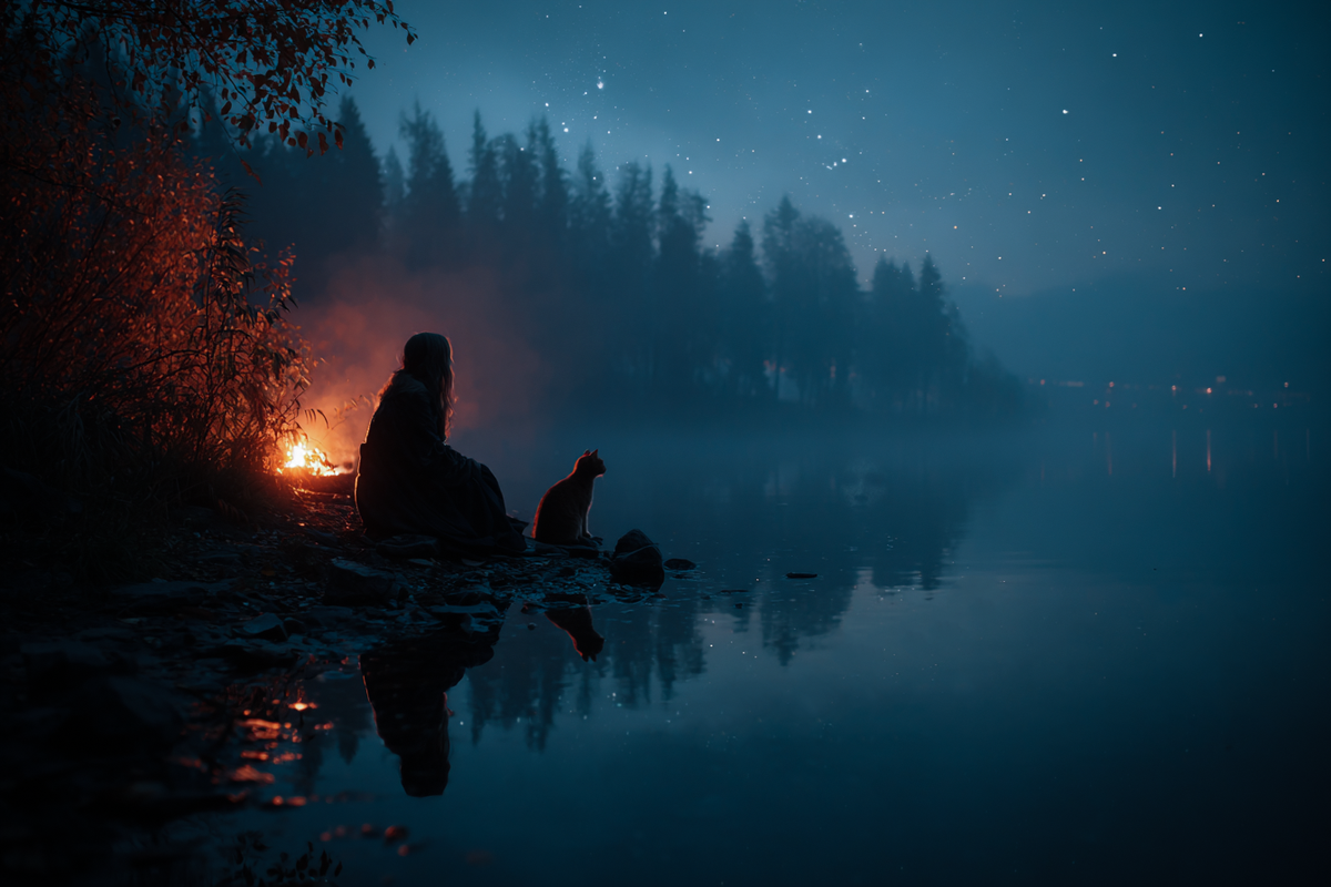 Костёр занимался нехотя, словно сам воздух этого места сопротивлялся теплу и свету. Но упрямая княжна не сдавалась, и вскоре языки пламени зализали сучья, отбросив тени на стволы деревьев. Марфа сидела, прижав колени к груди, и рассматривала чёрную гладь воды. Оттуда на неё смотрело собственное отражение: усталое, перепачканное землёй лицо с широко раскрытыми глазами, в которых плясали отблески огня. Где-то далеко, в горах, прокричала незнакомая ночная птица, и эхо подхватило её крик, разнеся по всему лесу. Суседко привалился сбоку, уютно мурлыча, словно самый обычный кот.