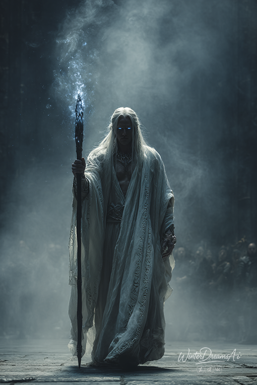 Белоснежные одежды, расшитые мерцающими рунами, струились по крепко сложенному стану, переливаясь, как иней под зимней луной. В руке незваный гость сжимал посох с сапфировым навершием, от которого исходило холодное сияние. Голубые искры рассыпались по полу, оставляя за ним мерцающий след.