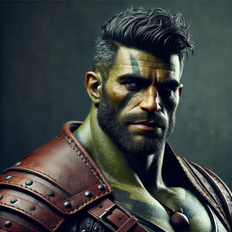 Массивный орк с угрюмым лицом и яркими голубыми глазами, словно сияющими в полумраке, смотрел на меня. Его кожа была серо-зеленой, а короткие черные волосы были аккуратно уложены, слегка взъерошены. Густая и ровная борода обрамляла его лицо.