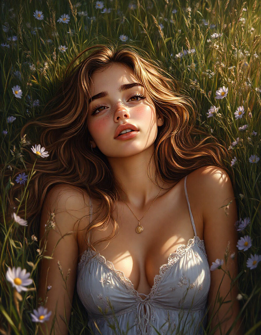 Красавица в легком платье белого цвета сидит на коленях и собирает букет, тщательно исследуя каждый цветочек в своих руках. Она не видит ничего и никого вокруг, так сильно поглощена своим занятием.