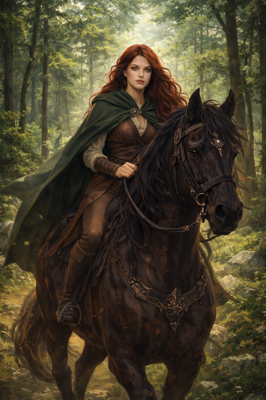Молодая женщина, человеческая самка, ещё достаточно молодая. Она стояла на тропе между деревьями, держа какое-то животное на четырех лапах под уздцы, и солнечный свет, пробивавшийся сквозь густую листву, ложился на её волосы тёплыми медными отблесками, подсвечивая их и создавая вокруг её головы некое сияние. Или это мне так казалось в моём состоянии?