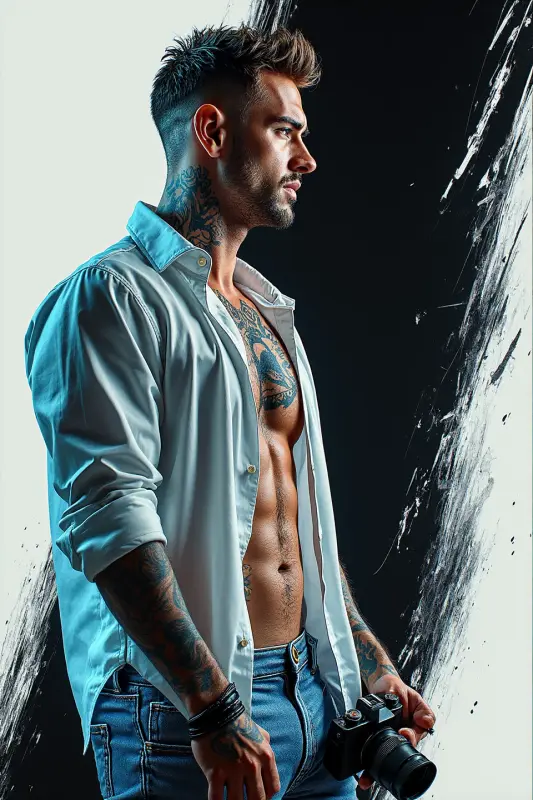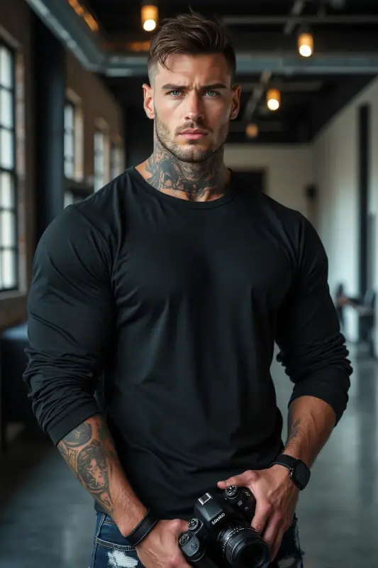 Короткая стрижка, выбритые виски, легкая небритость. На нем черная футболка, которая явно ему мала, и он об этом знает, намеренно обтягивая свой спортивный торс, рваные черные джинсы, белоснежные кроссовки, широкий кожаный браслет на запястье. На шее черная татуировка, как и на предплечьях.