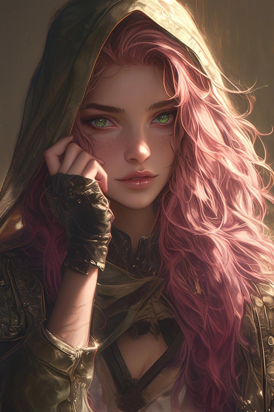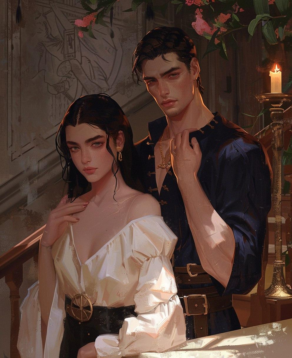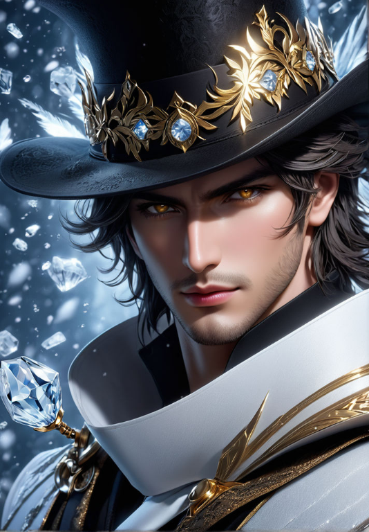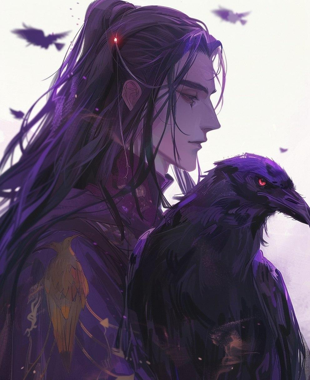 Длинные волосы, цвета темной фиалки, волнами ниспадали на плечи, словно вторя сумрачному великолепию его одеяния. Высокие сапоги и плащ, сотканный, казалось, из самой ночи, лишь подчеркивали этот мистический пурпур. Пряди у лица отливали черным аметистом, плавно переходящим в фиолетовый у кончиков. Взгляд его пронзительных темно-фиолетовых глаз приковывал к себе. Высокий, широкоплечий, с атлетической фигурой и чуть заостренным подбородком, он казался сошедшим со страниц глянцевого журнала, воплощением таинственной красоты и неприступной элегантности.