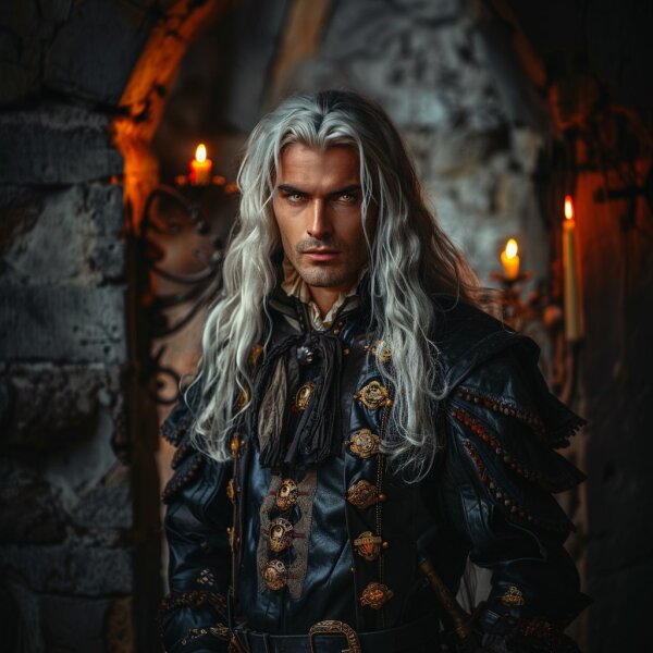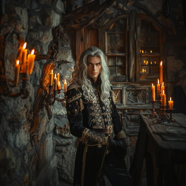 В массивном кресле вальяжно восседает крупная мужская фигура того самого воина, который выкупил меня у работорговцев. Густые серебристые волосы рассыпаны по мускулистым плечам, а обтягивающий военный камзол подчёркивает все достоинства фигуры.