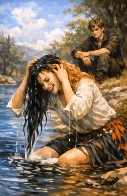 Алекса, смеясь, промывала и промывала волосы от черноты, стоя на коленях у реки.