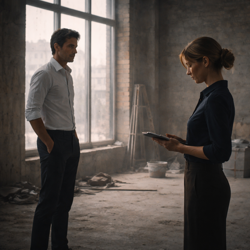 Мы пошли. Он показывал — профессионально, детально, с пониманием: вот зона ресепшена, вот коридор к переговорным, вот открытое пространство, которое нужно зонировать без потери объёма. Я слушала, делала пометки, задавала вопросы. Всё как положено. Всё как должно быть между заказчиком и подрядчиком.