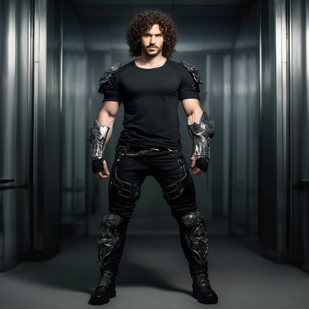 Так же на нем красовались сшитые из одной материи черные мерзам и прунты. Кожаные, с металлическими вставками в виде головы трецерикса, наколенники на прунтах поблескивали в неярком освещении лифта.