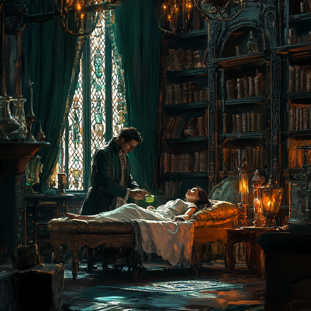 Комната наполнена утренним светом, который скользит через широкие окна, обрамленные тяжёлыми темными бархатными занавесями. Ткань их почти не пропускает дневное сияние, но в прорехах и складках рождаются узкие лучи, подобные клинкам, рассекающим серый воздух. Стены украшены полками, изготовленными из тёмного дерева, на которых аккуратно расставлены баночки и флаконы с зельями и мазями. Запах травяных настоев и терпкого воска пропитывает воздух, оставляя привкус горечи на губах. Некоторые флаконы покрыты слоем пыли.