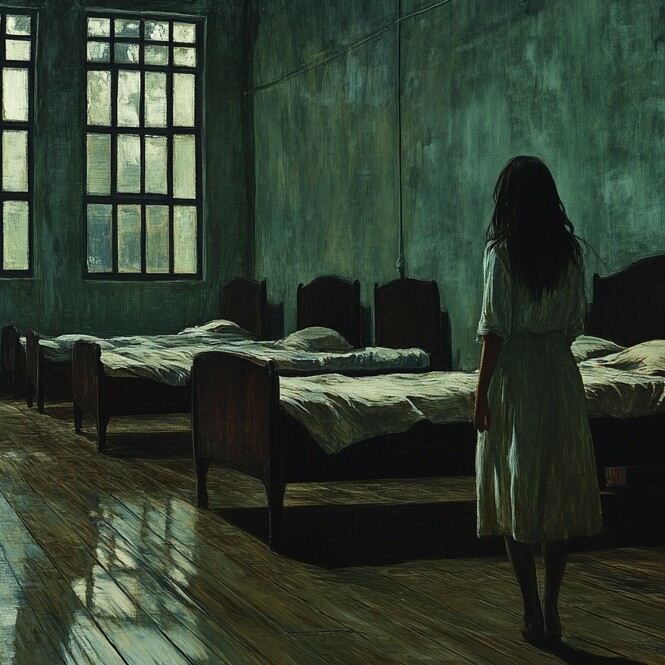 Общая спальня девочек приюта погружена в почти непроглядную тьму. Серебристое свечение луны в окнах едва достигает дальних углов комнаты. Воздух наполнен тяжёлым запахом старого дерева и слабым ароматом мелиссы. Мэй тихо подкрадывается к Лиззи, стараясь не разбудить других девочек. Кровать металлически поскрипывает, когда она аккуратно ложится рядом с подругой, которая беспокойно храпит в своём болезненном сне. Шепот Мэй рождается из страха и тревоги, разливаясь по комнате так тихо, что кажется, даже ветер за окном замирает, чтобы подслушать.