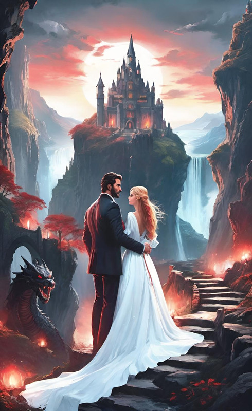 Картина изображала сказочный замок, расположенный на горе с многочисленными водопадами и цветущими садами. От замка к морскому побережью вела просторная дорога, на которой стояли друг напротив друга высокий красивый мужчина и романтичная девушка в белом простом платье.