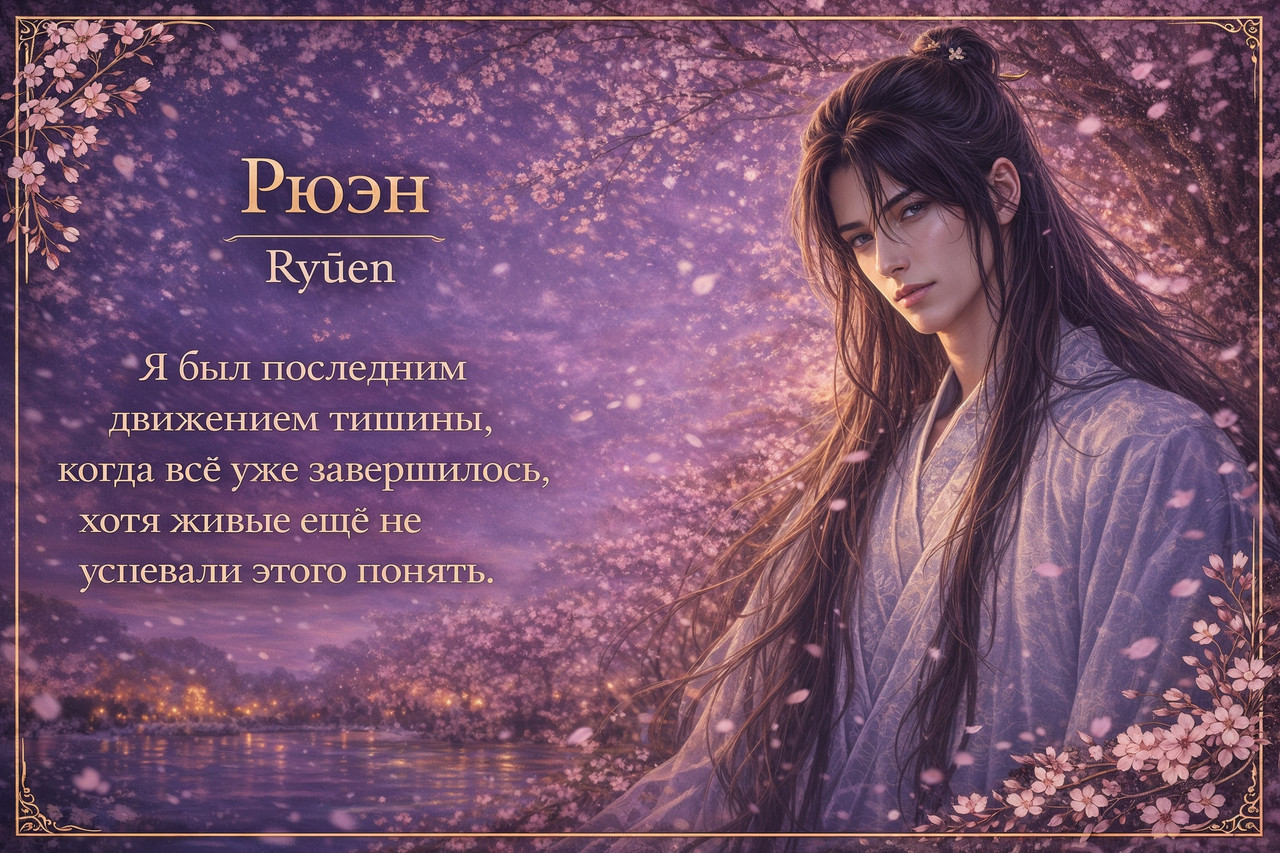 Я не помнил, когда впервые осознал себя. Не помнил, было ли у меня лицо, имя, тело, голос, память о чьих-то руках, память о собственном дыхании. Иногда мне казалось, что когда-то всё это у меня было, но мысль исчезала раньше, чем я успевал в неё вглядеться. Прошлое не открывалось передо мной дверью – оно оставалось стеной, гладкой, холодной, без трещин, за которые можно было бы зацепиться. Я знал только то, что знал всегда: это место было связано со мной так же неразрывно, как корни сакуры – с землёй, и моя функция не требовала объяснений. Я приходил к тем, чьё время подходило к границе. Я сопровождал их дальше. Я не выбирал и не вмешивался. Я был не судьбой и не судом. Я был последним движением тишины, когда всё уже завершилось, хотя живые ещё не успевали этого понять.