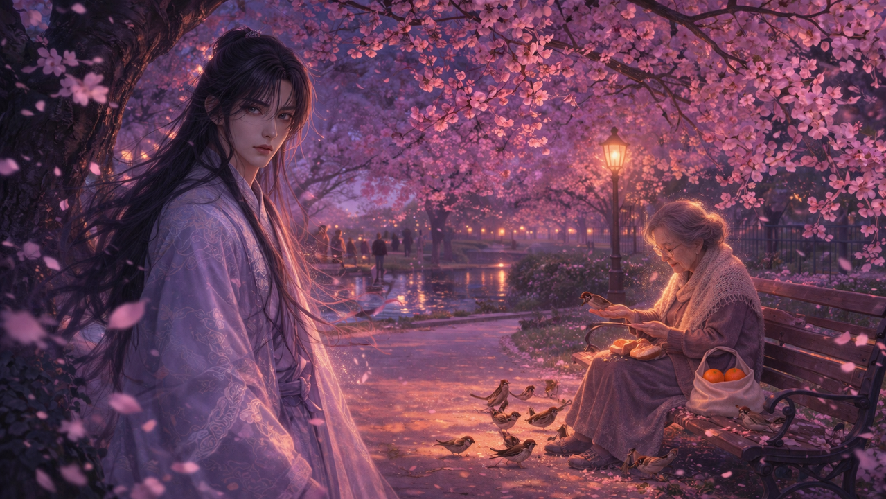 Ветер усилился, и над нами прошёл длинный шелест, похожий на выдох. Несколько лепестков закружились вокруг неё, застряли в волосах, на плечах, на складках пальто. Она не стряхнула их. Некоторое время сидела неподвижно, будто позволяя этому хрупкому снегу лечь на себя полностью.