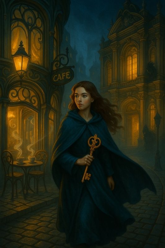 Она сжала ключ, и время дрогнуло: Тенеград замер, дома застыли, как статуи. Она шагнула вперёд, и тени потянули её сквозь стену дома, выводя на другую улицу. Её сердце колотилось, страх и восторг смешались, как вино.