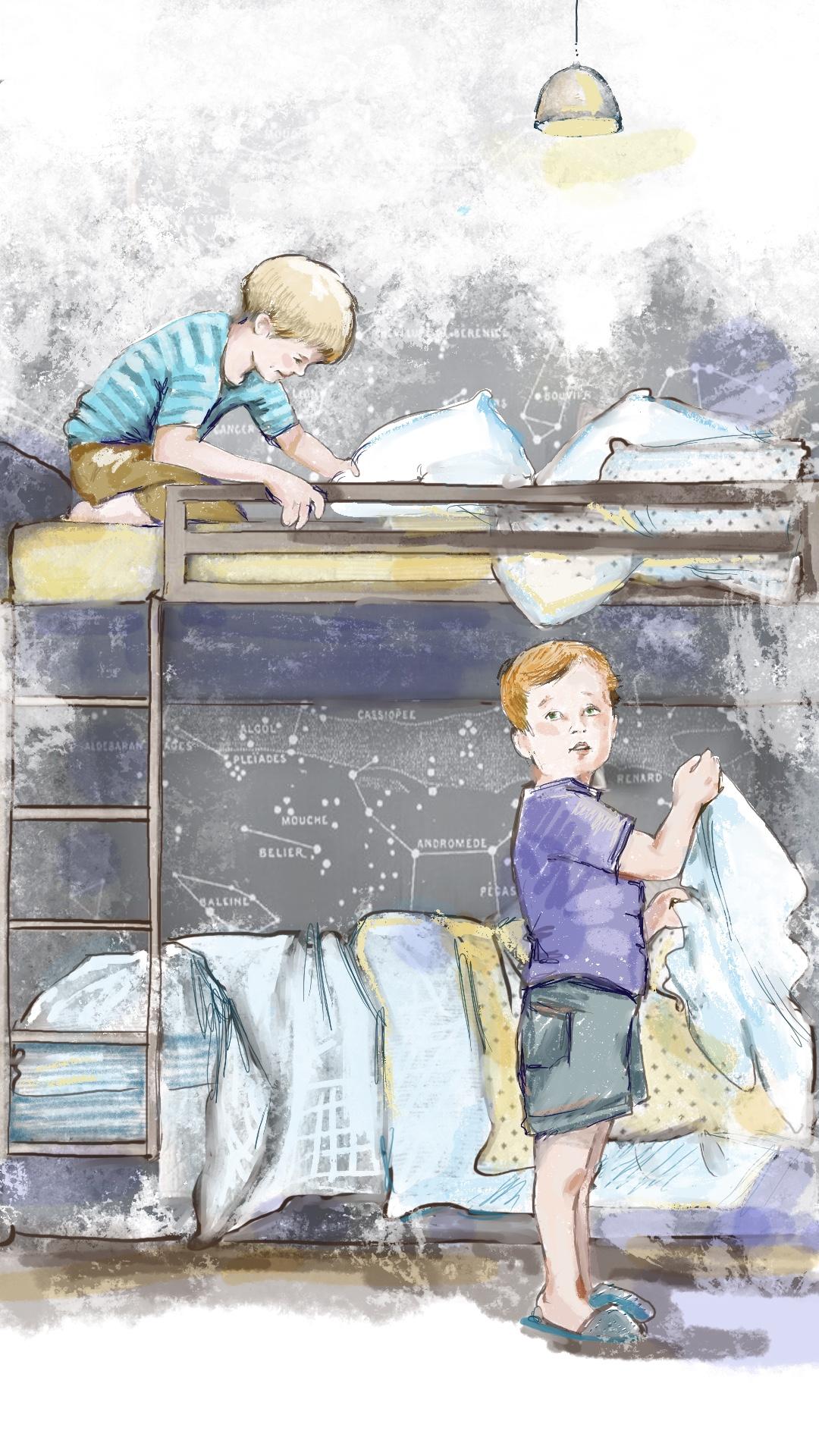 Стёпка сразу на кровать заскочил двухъярусную. На самый верх взобрался. И давай прыгать под самый потолок.