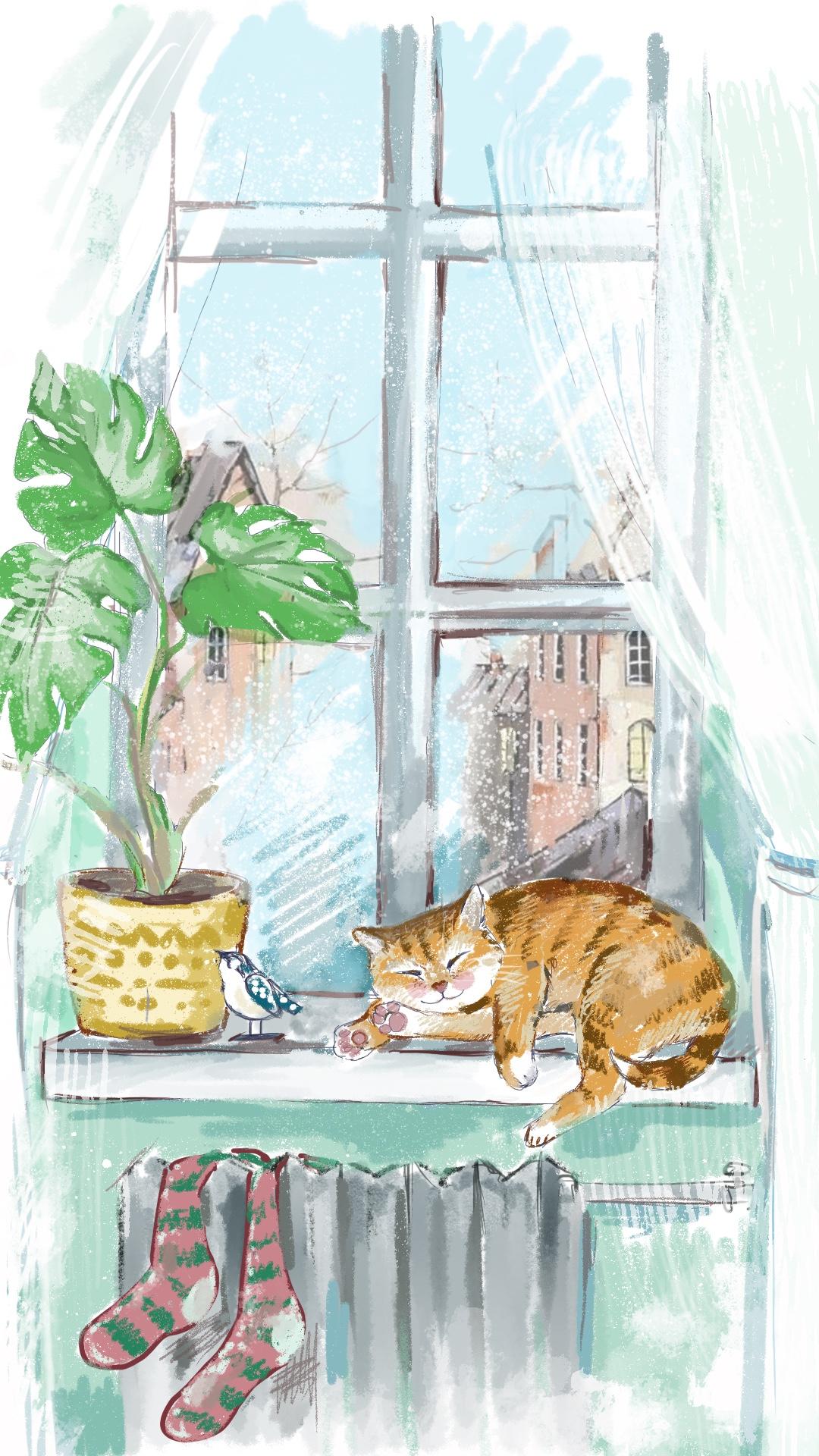 Кузьмич гладил котика Тимку и тоже смотрел в окно. Он даже имитировал звук вздоха через динамик, чтобы показать, как прекрасна зима. А вот котик имитировал довольное урчание.