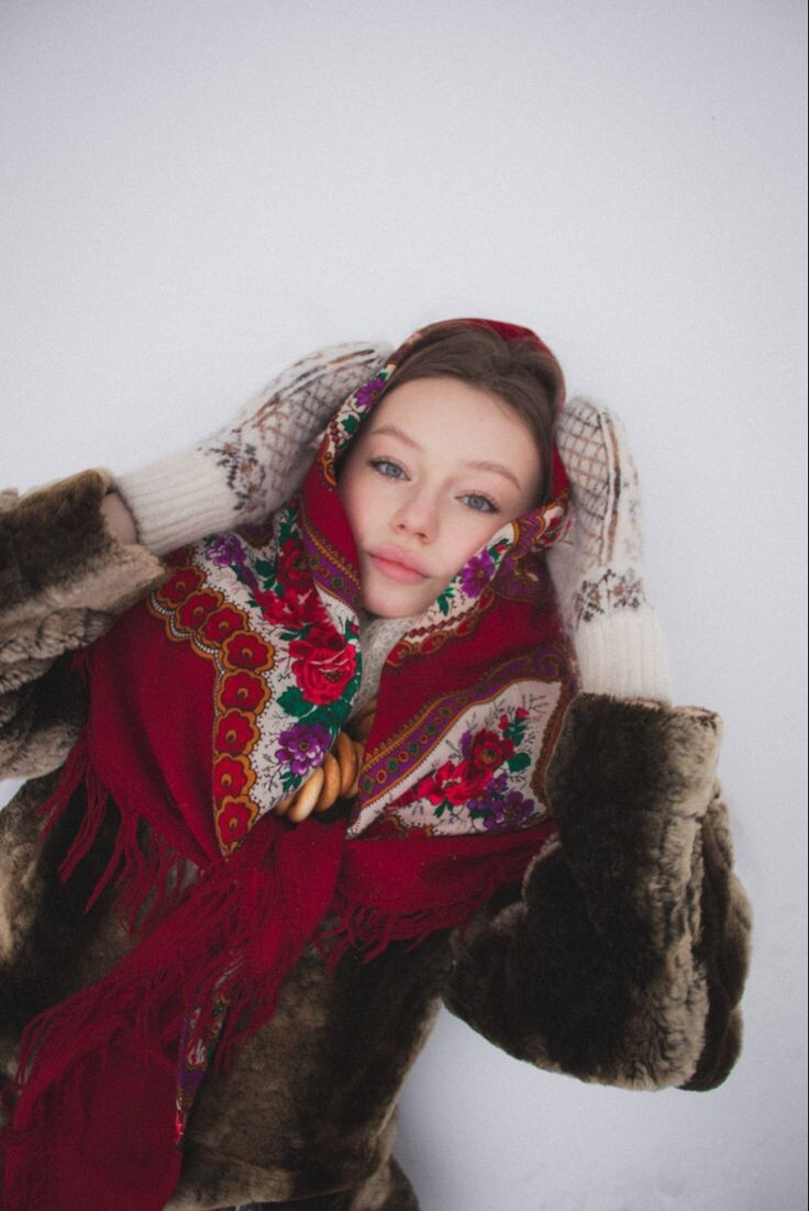 Я, конечно, понимаю, что есть такой головной убор и в некоторых странах он даже очень распространён, мне даже нравились дамы, когда на них были одноцветные или современные платки, но Настя была в цветастом платке из реквизитов народного ансамбля.