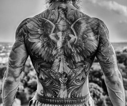Я замерла в дверях, потрясенная открывшимся видом. Спина и плечи мужчины были полностью покрыты татуировками. Четко посередине спины широко раскинул крылья огромный черно-белый ангел женского пола. Чуть ниже расположился еще один, а у основания шеи был изображен восседающий на шаре купидон. Все это было окружено переплетающимися узорами, уходящими вниз под полотенце. Часть татуировки переходила на плечи, обвивала верхнюю часть рук. Несмотря на то, что изображение было полностью черно-белым, благодаря тонким линиям и обилию теней оно не было резким. И безумно красиво подчеркивало безупречный рельеф спины, плеч и рук.