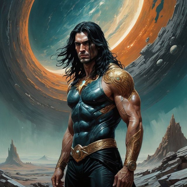 Я посмотрела сквозь пряди. Вошел великан. Сильная мускулатура покрывала его грудь. Кубики живота уходили вниз и прятались в кожаных штанах. Длинные черные волосы падали на могучие плечи. На груди горел синим какой-то прибор. Из-под широких бровей сверкнули золотистые глаза.